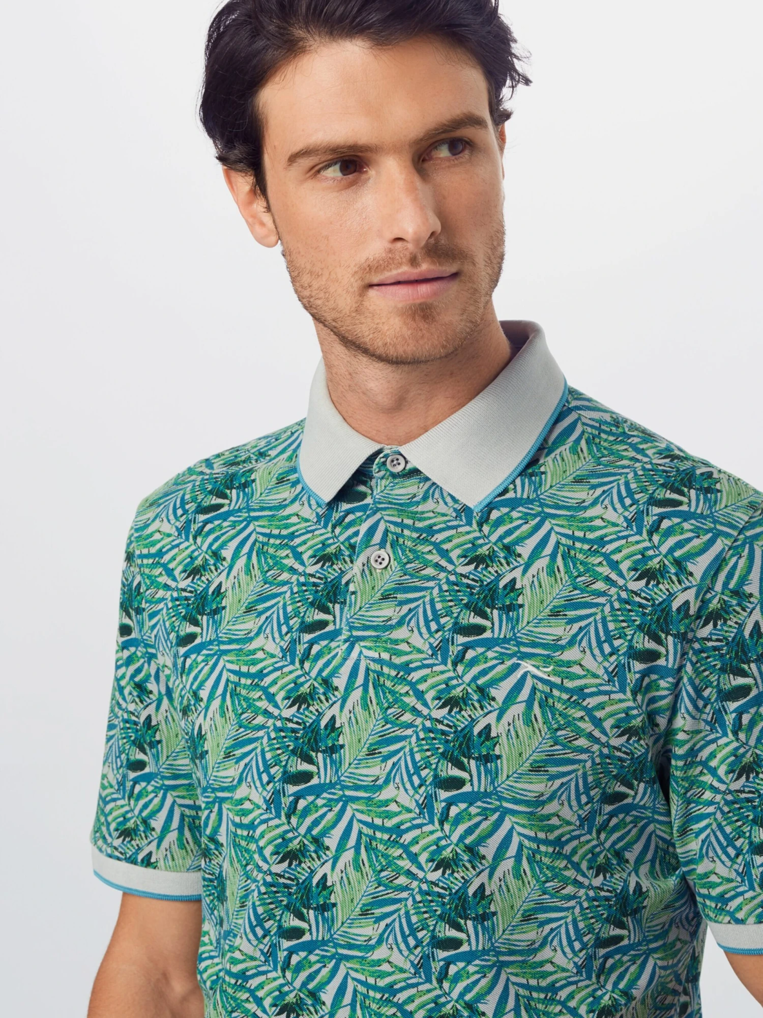 BloemenprintJerseyPolokraagGevoerde zoom/randRechte zoomTurn-down kraagAll-over patroonOp staal nadenVoelt zacht aanKnoopsluiting