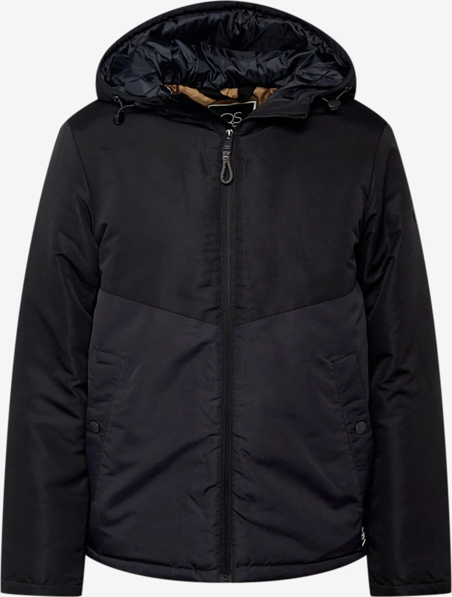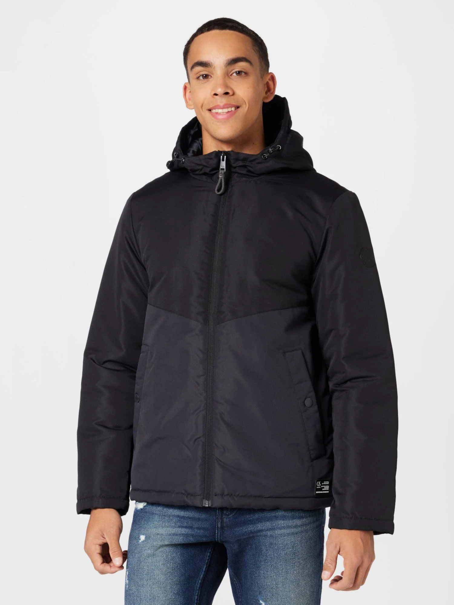 Color-BlockingStaande kraagBinnenzakZakken aan de zijkantVerstelbare capuchonLabel patch/label flagGladde stofLicht gevoerdRitssluiting